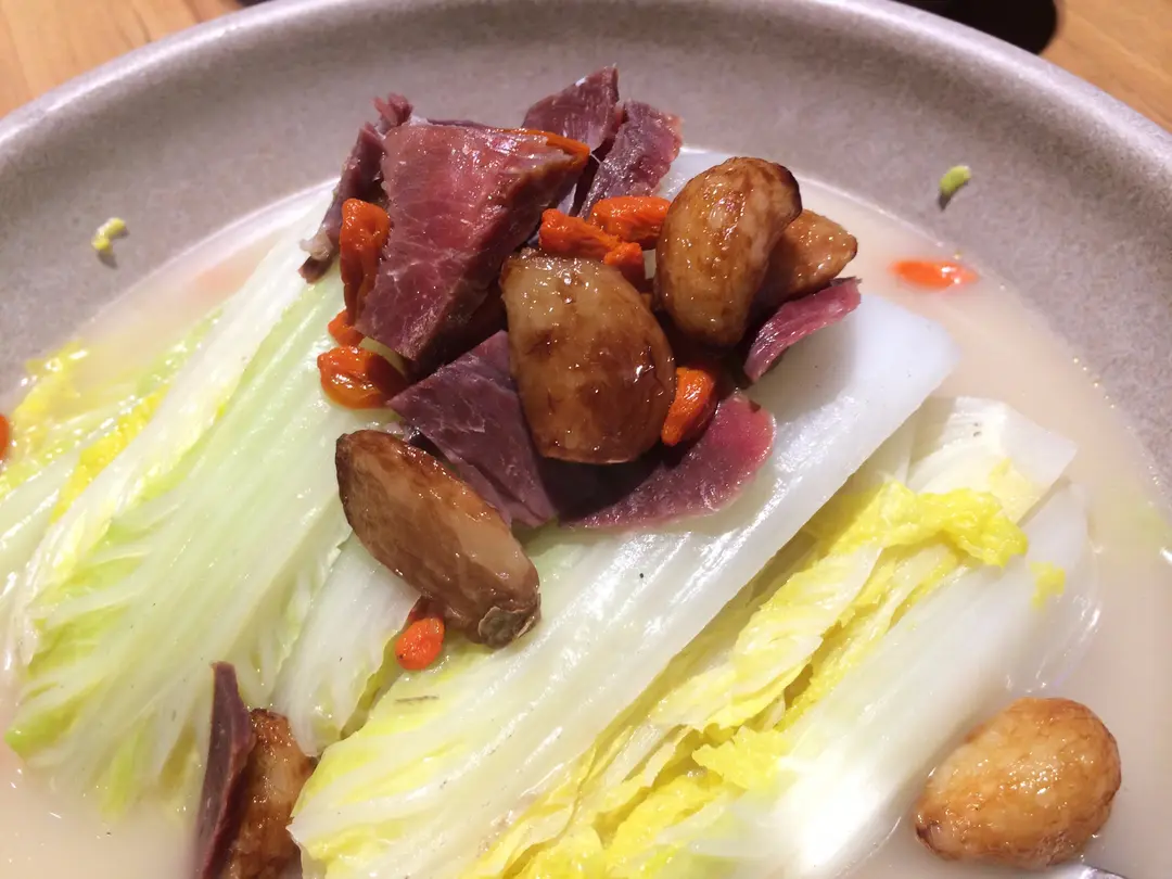Chinese cabbage with fried garlic cloves and Jianhua ham