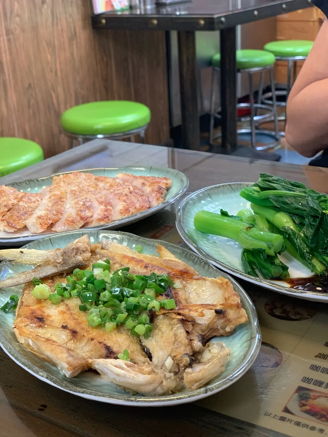 煎魚$60,肉餅拼油菜$45