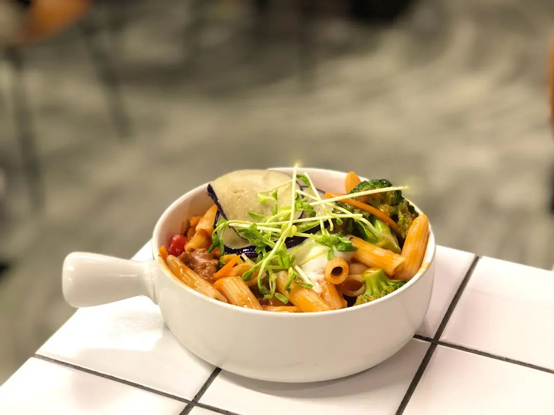 Impossible 溫泉蛋茄汁野菜肉碎長通粉