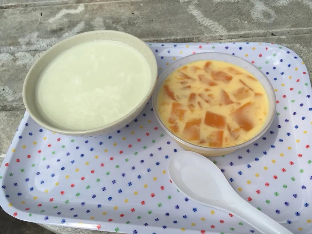 右,薑汁撞奶。左,鮮奶芒果布丁