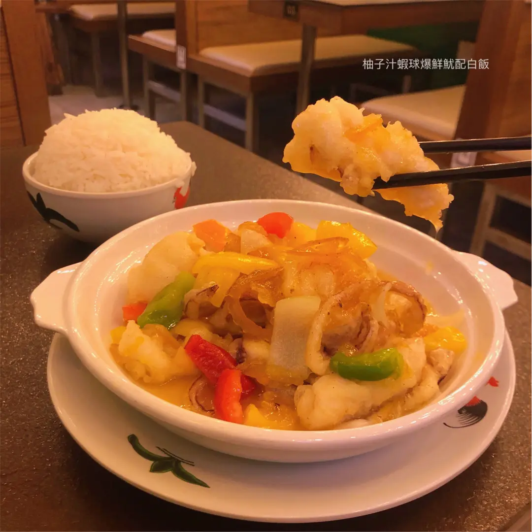 柚子汁蝦球爆鮮魷配白飯