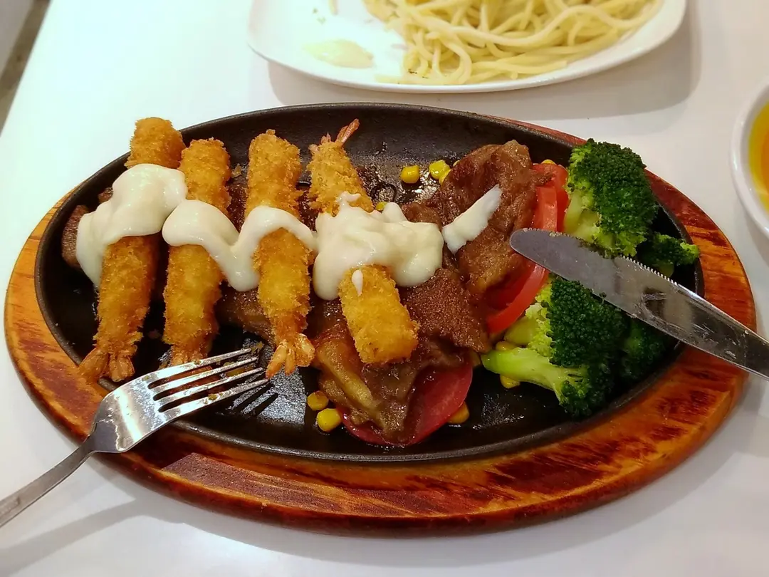 黑椒香蒜牛扒拼炸蝦 ($80)