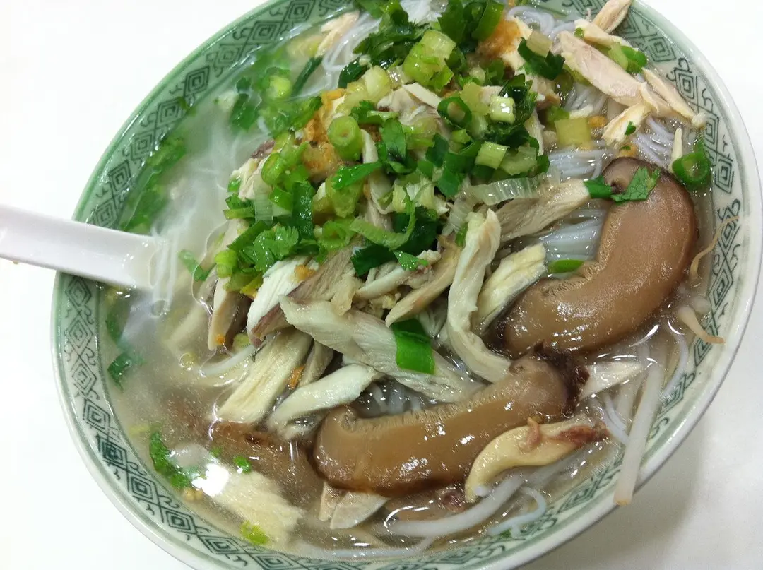 鋪滿雞絲和冬菇絲,再灑d蔥花同芫茜係面,正