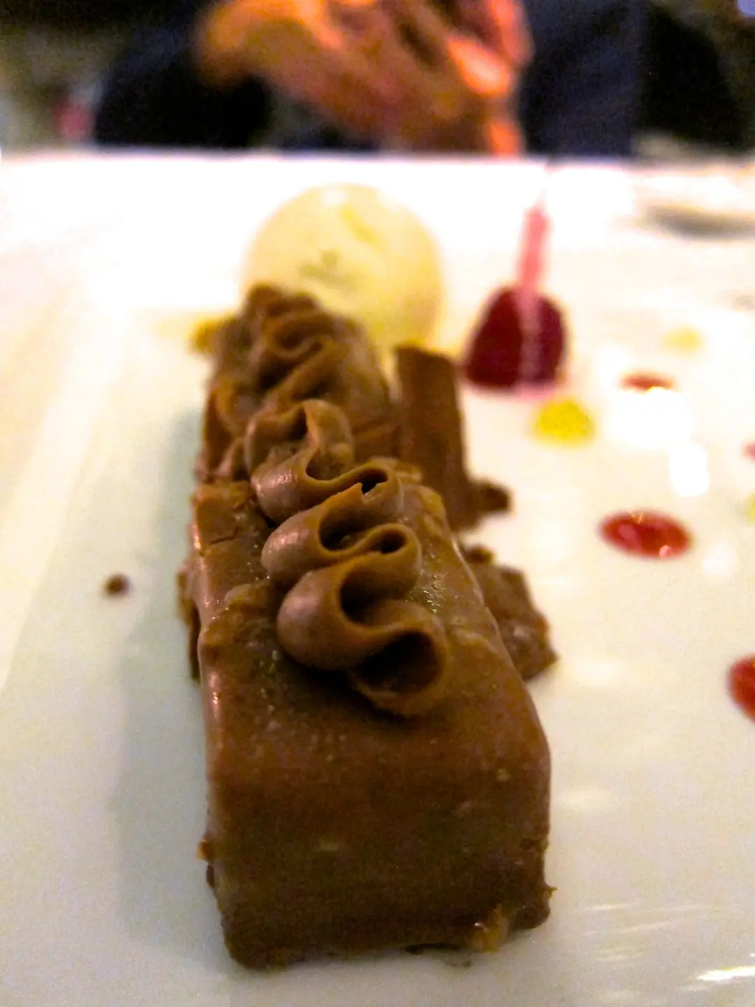 Lime and Banana Bar Crispy feulletine & praline with banana & lime mousse serve with vanilla ice cream ($88)