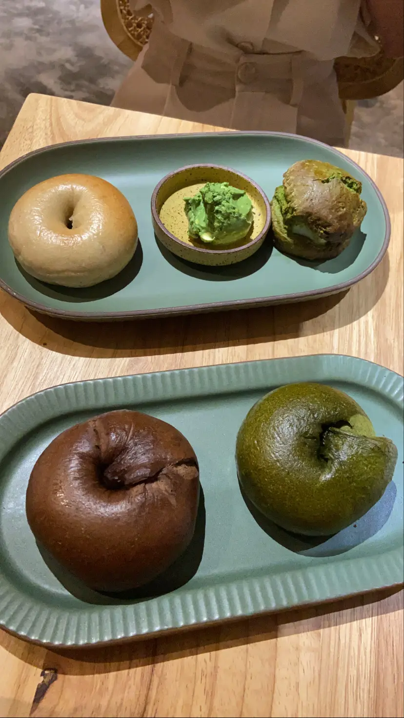 原味貝果配開心果忌廉芝士(左上)