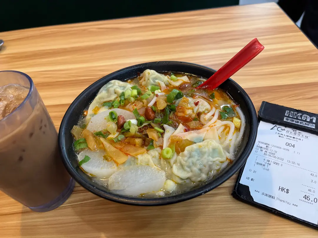 蘿蔔韭菜餃麻酸辣米線 + 凍奶茶