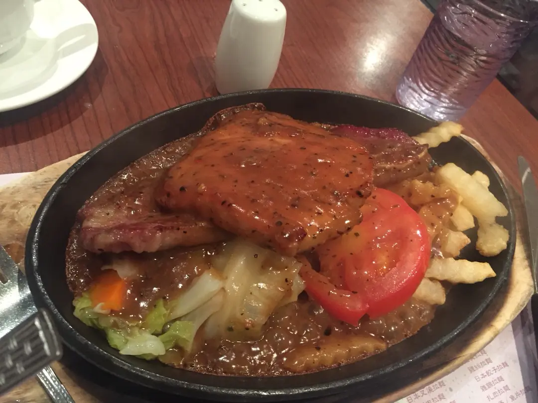 鐵板黑椒汁豬扒加牛仔骨 配薯菜