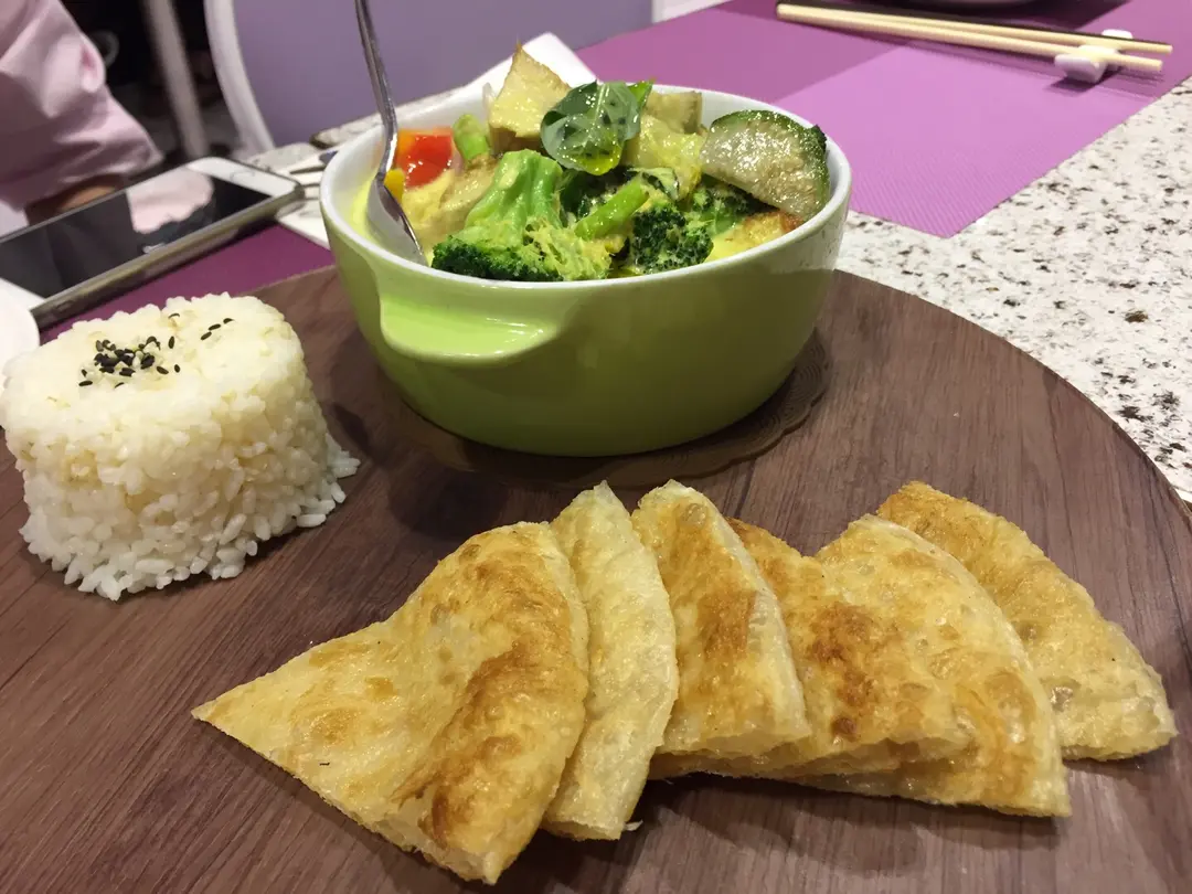 青咖哩野菜猴頭菇配印度薄餅同珍珠糙米飯