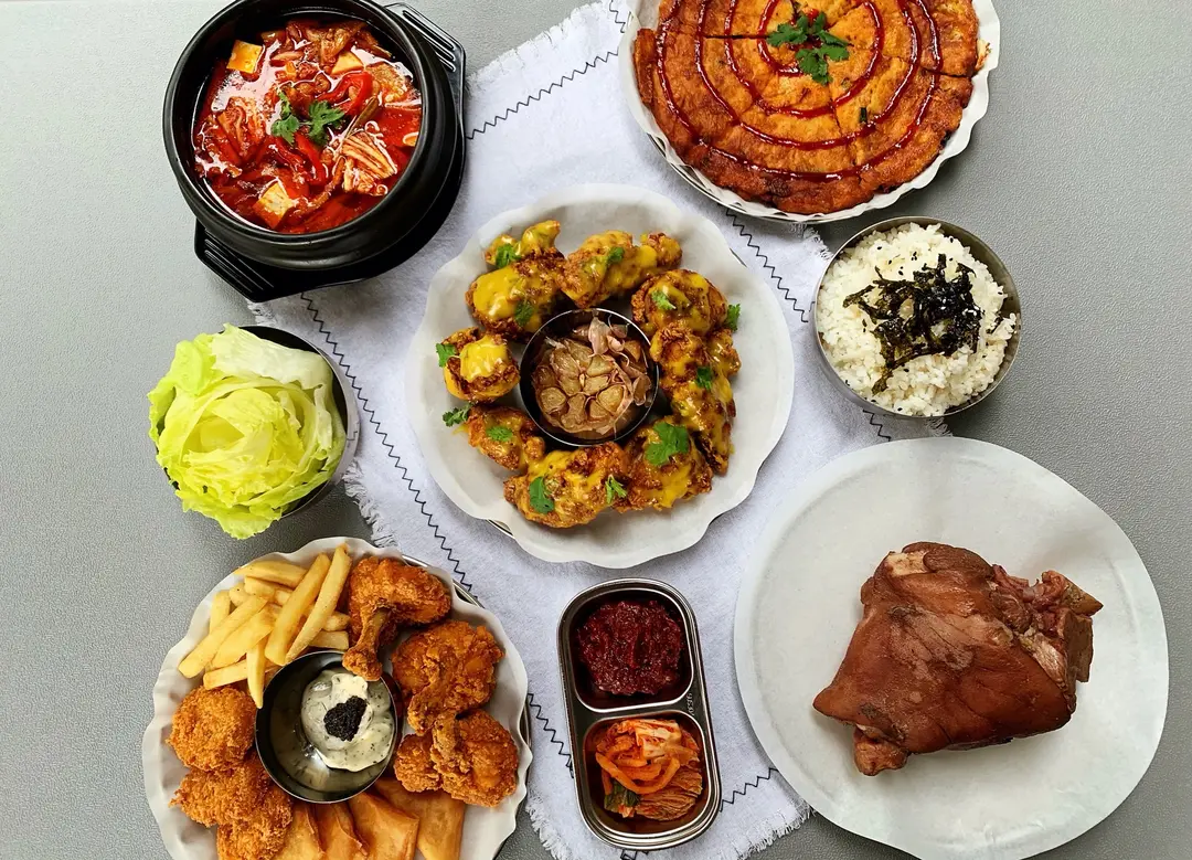 香檸蜜糖芥末炸雞(中)、泡菜逐肉湯(左上)、雜錦炸物拼盤(左下)、炖豬腳(右下)、泡菜煎餅(右上)