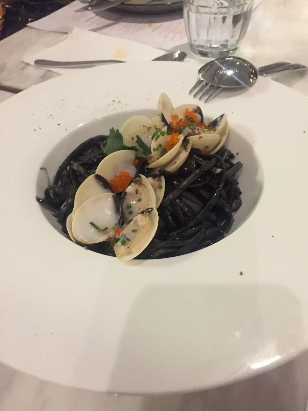 香炒新鮮蜆仔配墨汁青檸扁意粉
