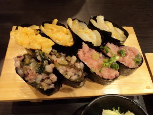 香蔥吞拿魚腩軍艦壽司、芥辣八爪魚軍艦壽司、黃金魷魚軍艦壽司、海膽魷魚軍艦壽司