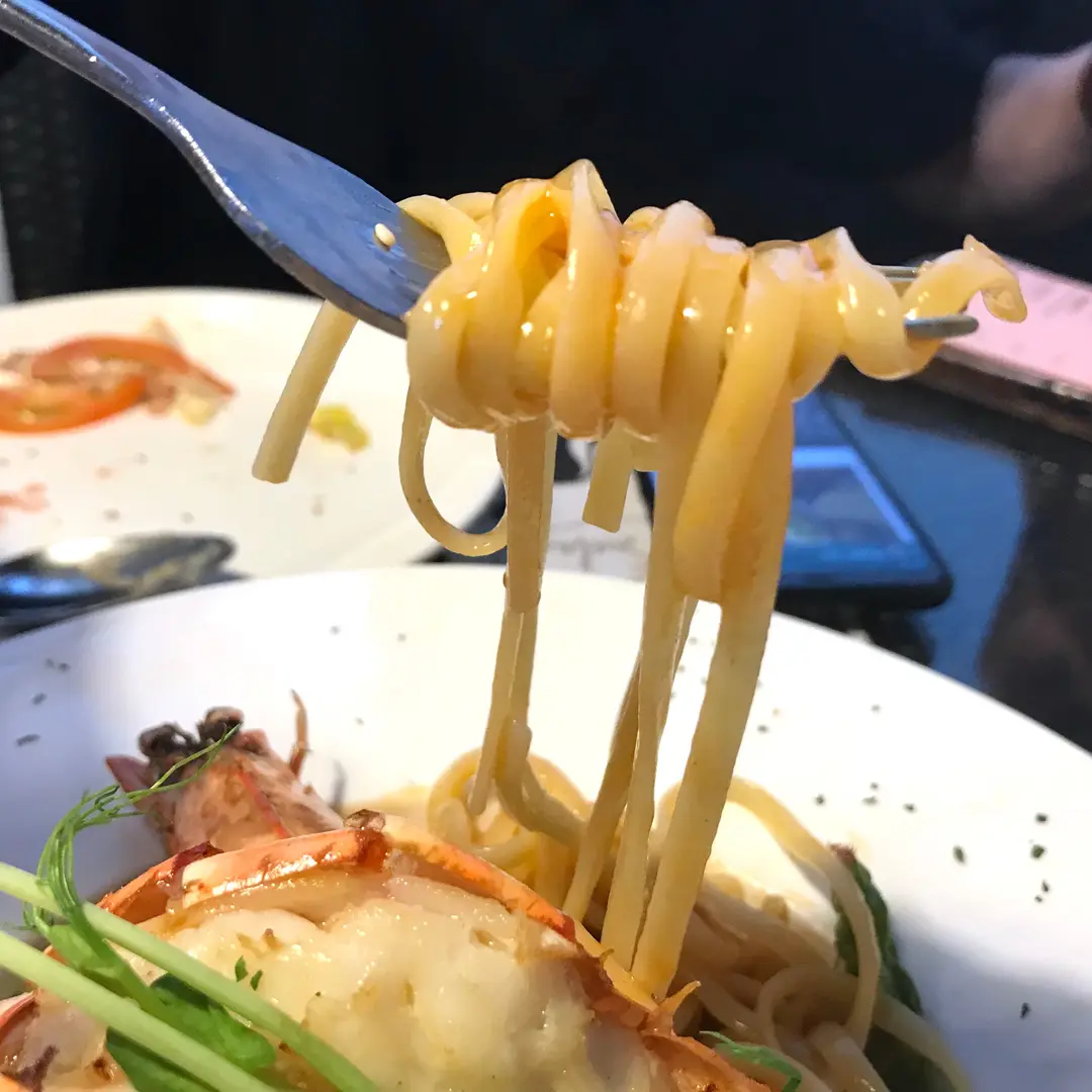 扒大虎蝦配龍蝦汁扁意粉