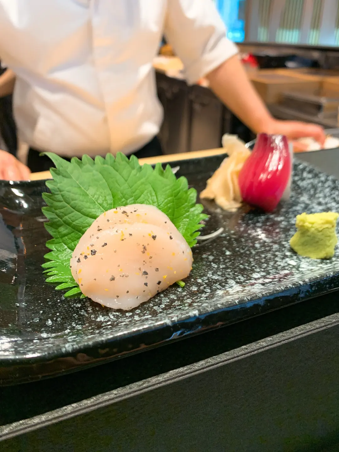 帶子刺身(上面配有竹碳鹽及檸檬皮)