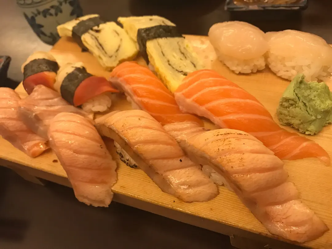 火炙三文魚腩、玉子、帆立貝、三文魚腩、北寄貝壽司