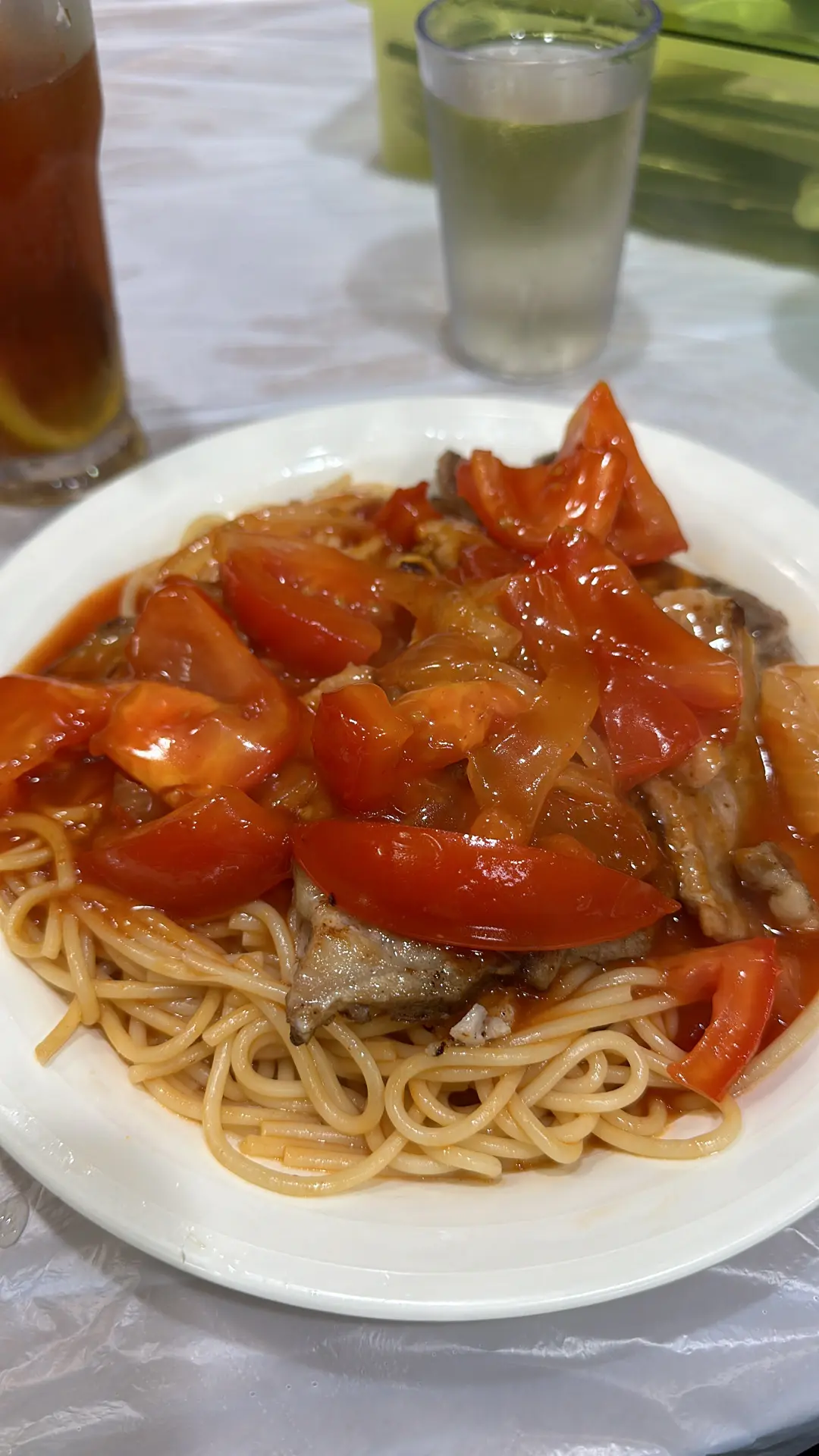 鮮茄豬扒意粉 ,涷檸茶