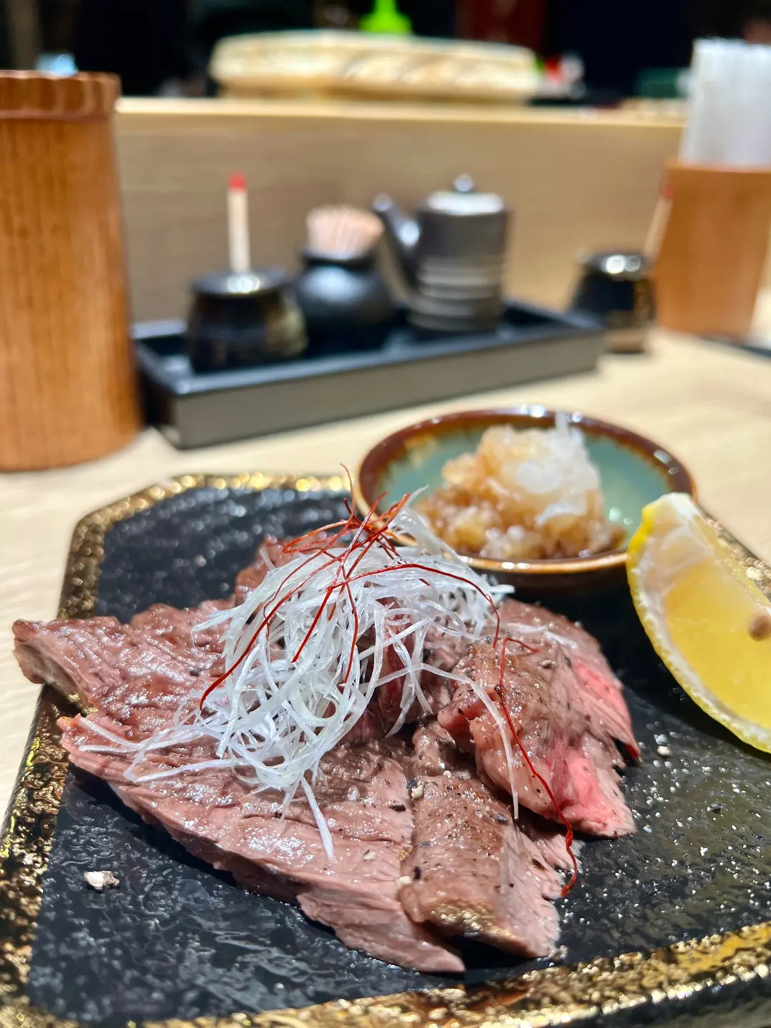 鹽燒牛橫膈膜肉配蘿蔔茸柑橘酢