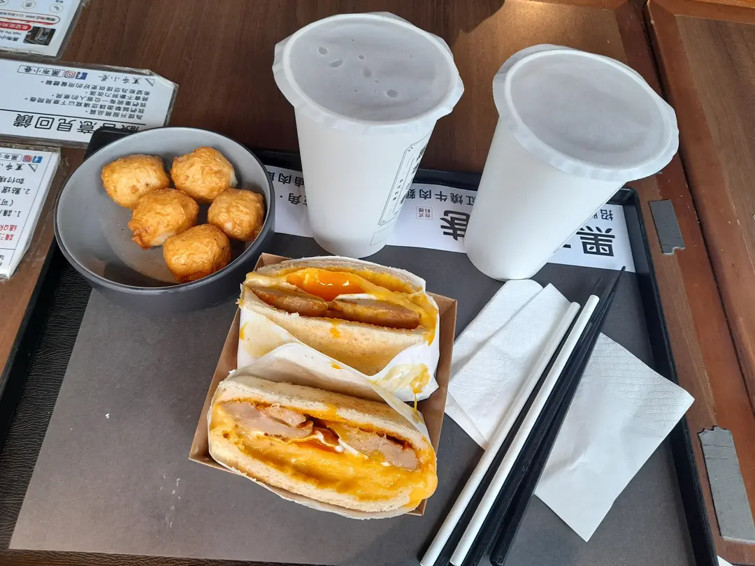 慢烤雞腿芝士蛋吐司,花枝丸配淮鹽5粒,白桃烏龍茶同少甜冬瓜茶
