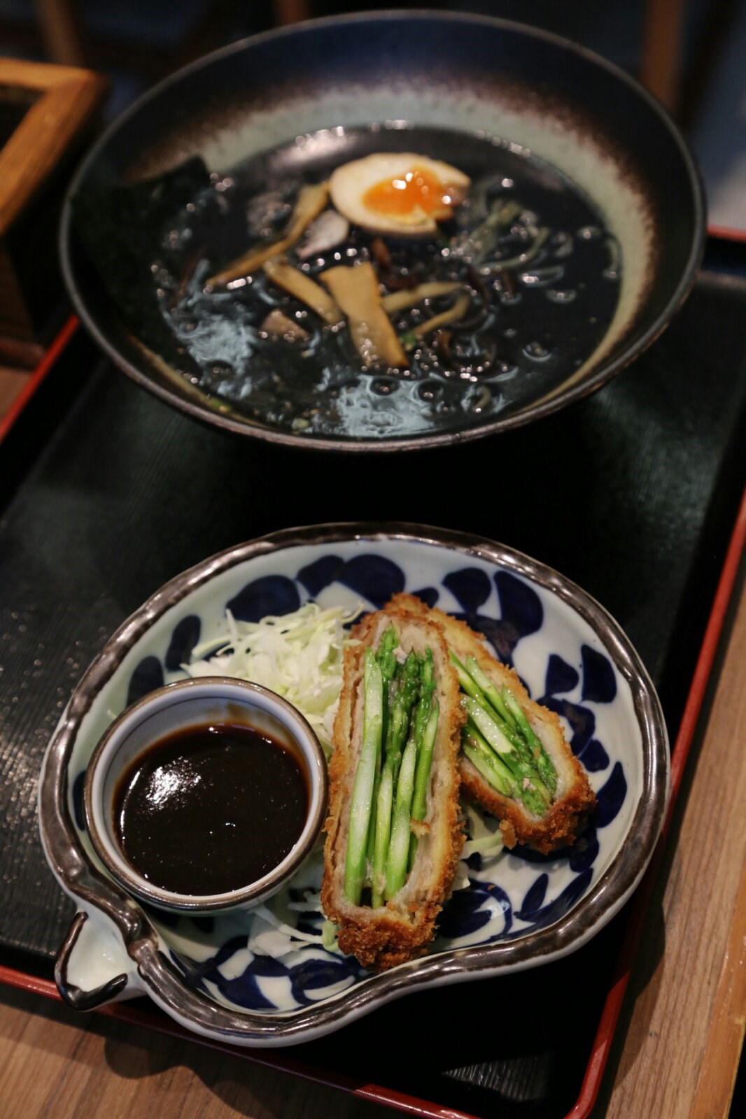 吉列露筍豚肉卷黑墨豚骨湯拉麵