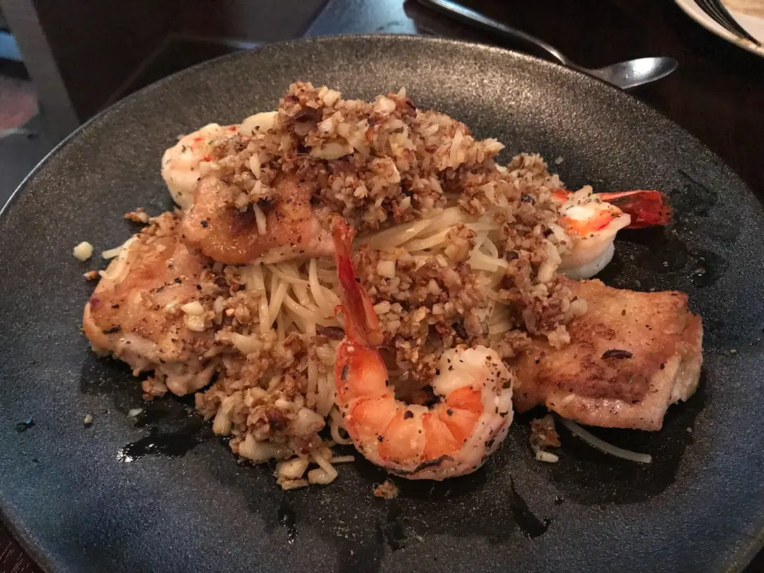 香煎橄欖油無骨雞髀加大蝦意粉