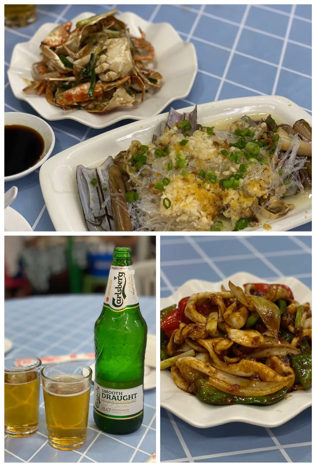 薑蔥蟹、蒜蓉蒸蟶子、豉椒炒鮮魷、嘉士伯Smooth Draught