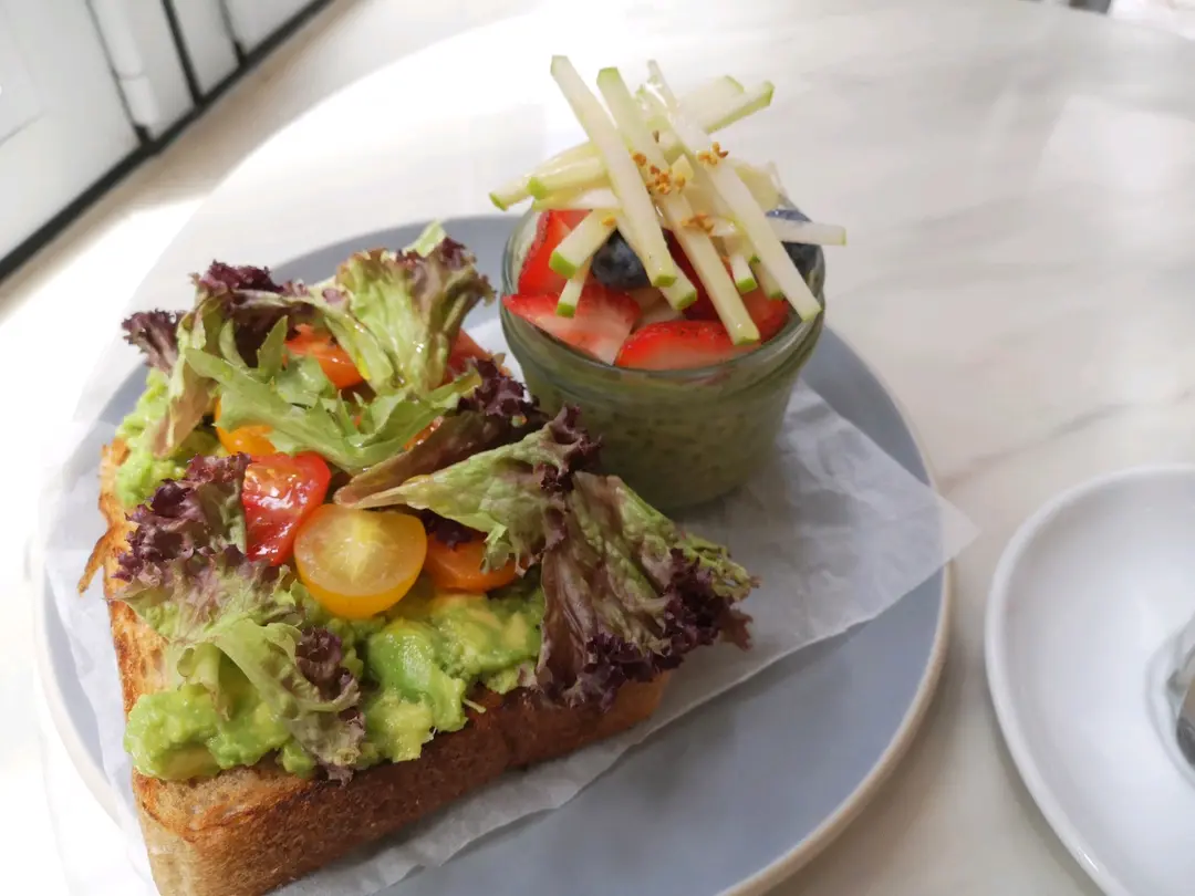 牛油果吐司和小份抹茶燕麥奶麥片