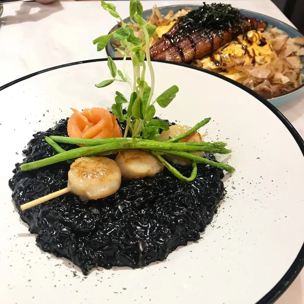 墨汁意大利飯配北海道刺身帶子及煙三文魚