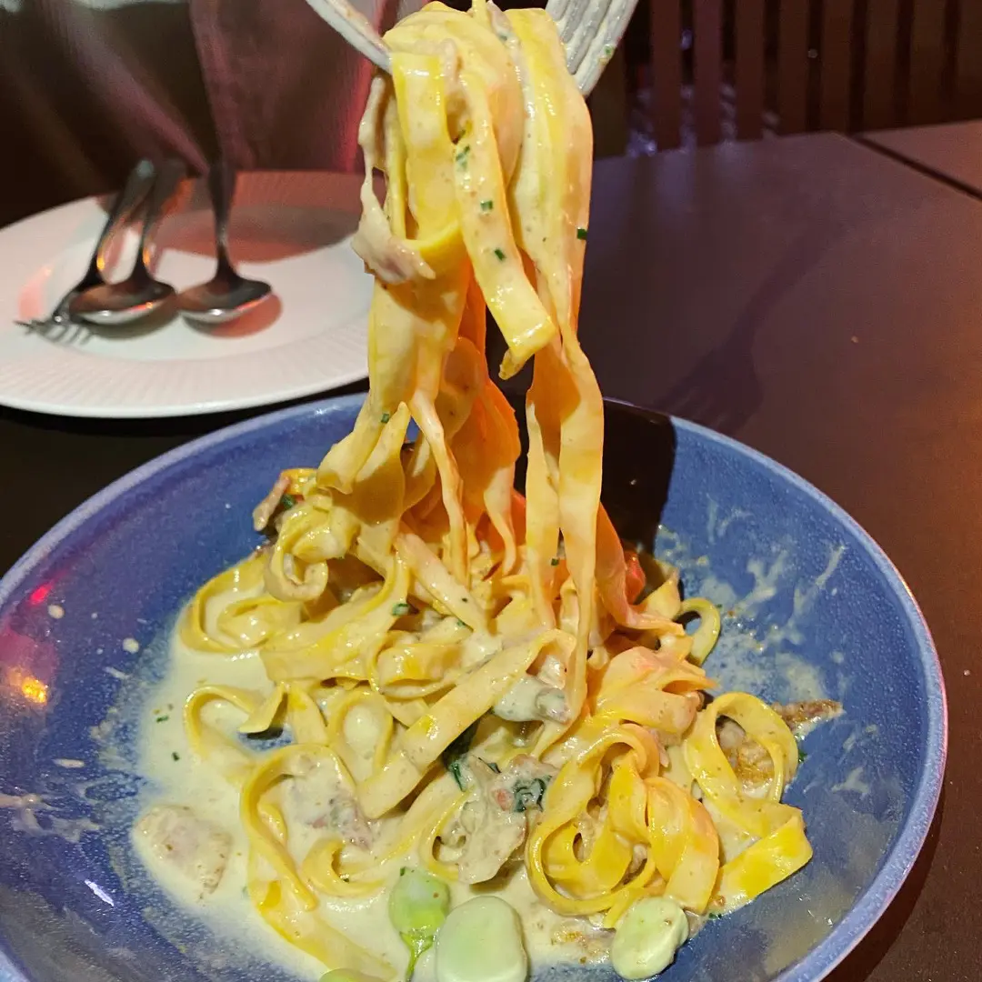 Tagliatelle pasta with fava beans, pancetta and artisanal stracchino cheese