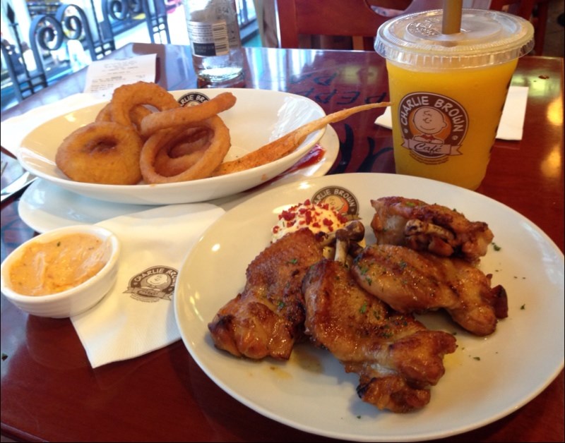 Snoopy Chix Wing, Onion Ring, Mango Frappa