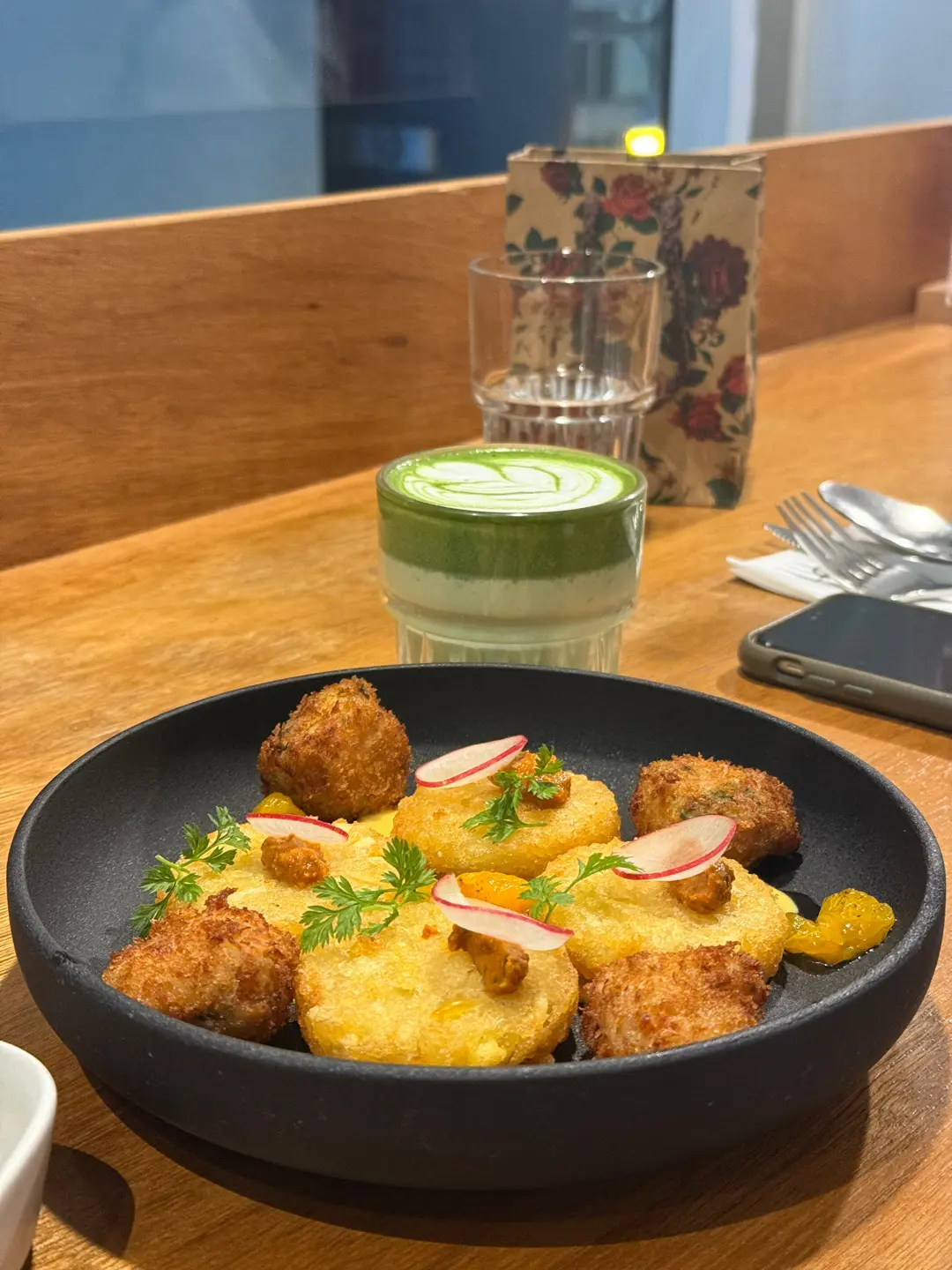 炸蟹肉球拼薯餅配蜜糖芥末醬及茄乾醬