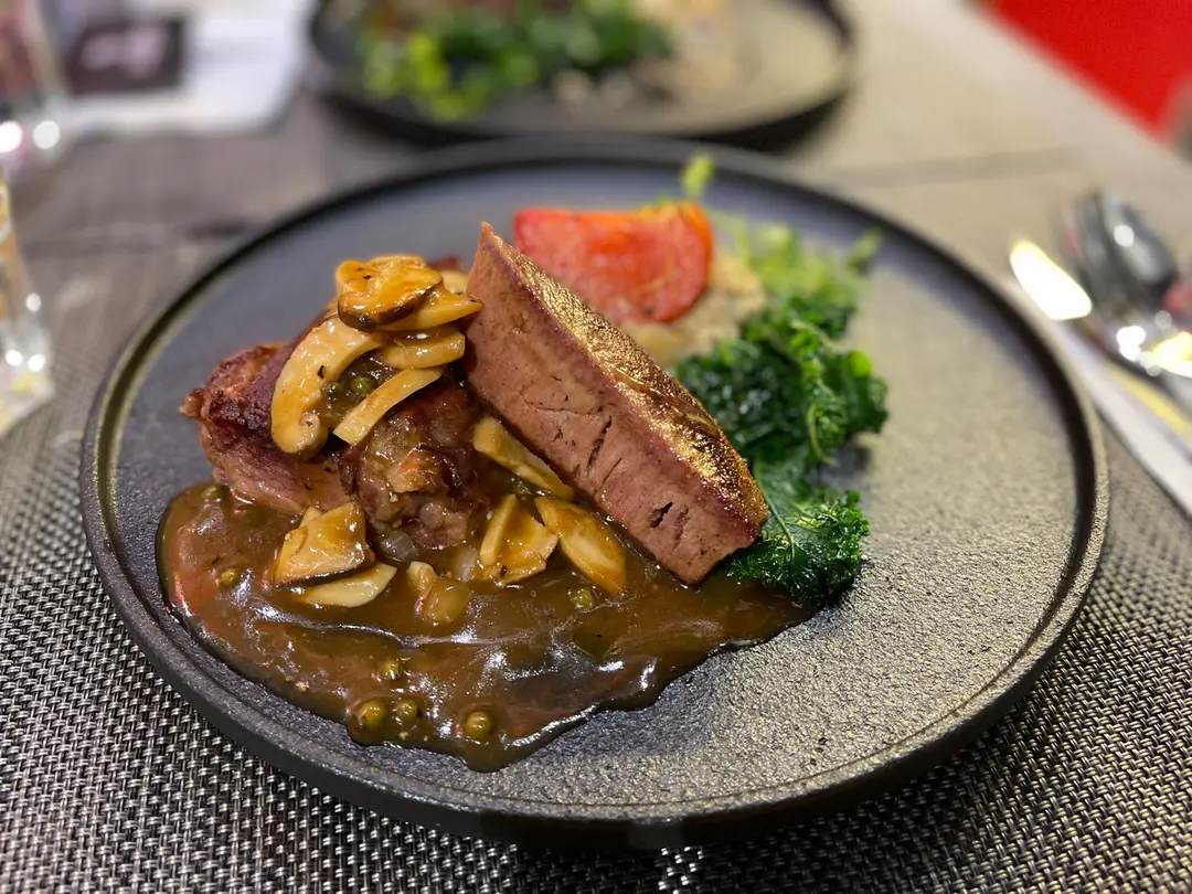 香烤美國熟成牛舌配青胡椒蘑菇汁