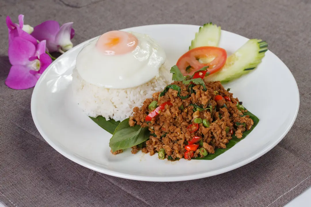 Fried Pork w Basil and Fried Egg (with Steamed Rice) 羅勒香葉碎肉飯