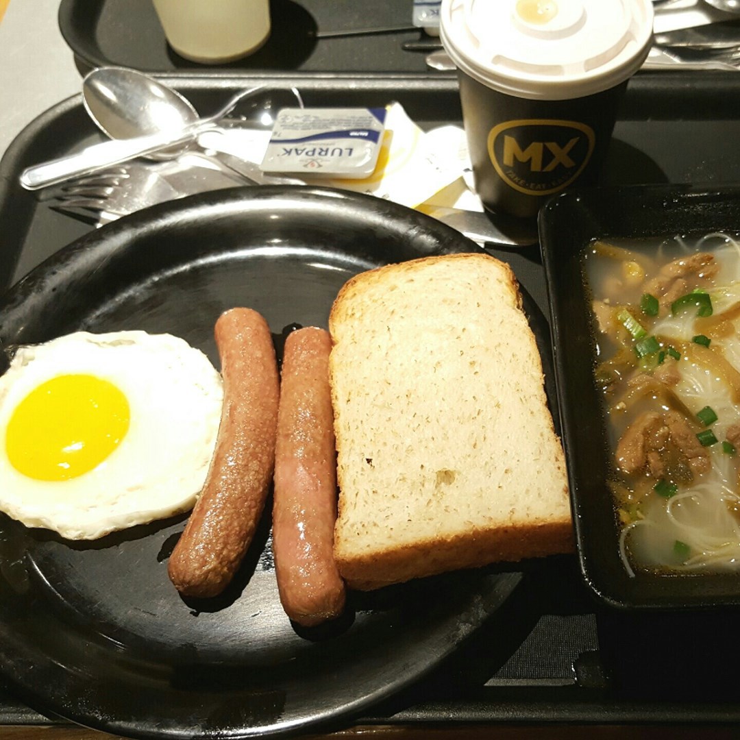 港式早餐 粗麥多士、腸仔煎蛋、榨菜肉絲湯米及熱奶茶