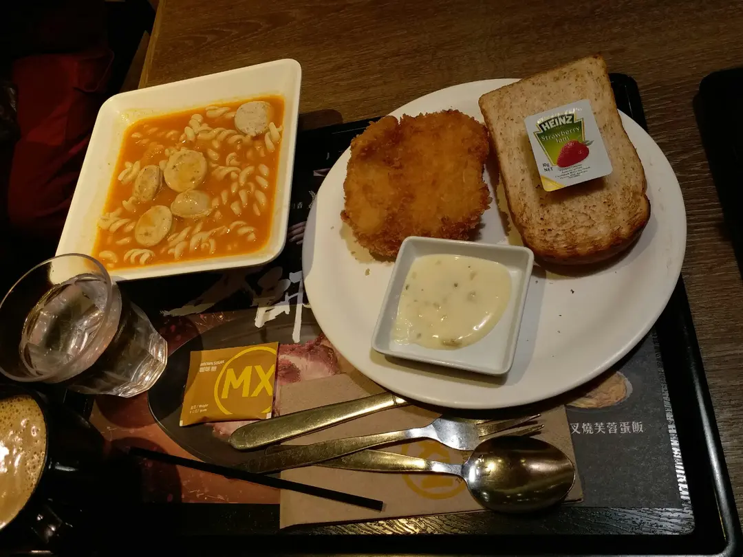 龍蝦濃湯螺絲粉配脆嫩魚柳,粗麥多士熱咖啡
