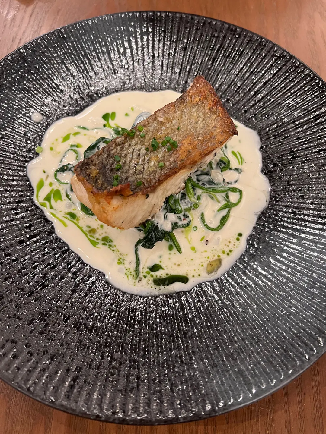 Atlantic Seabass Fillet (atlantic seabass fish w/ creamy spinach & beurre blanc)