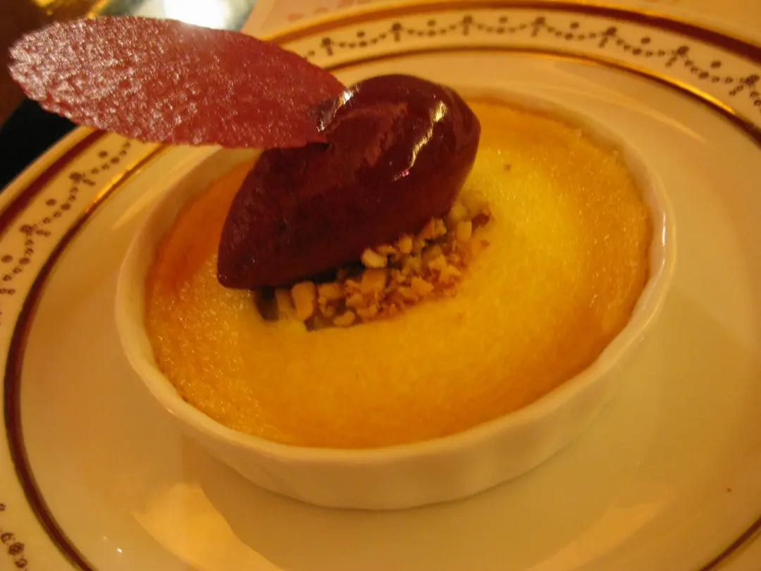Pear clafoutis with macademia nuts and cassis sherbet