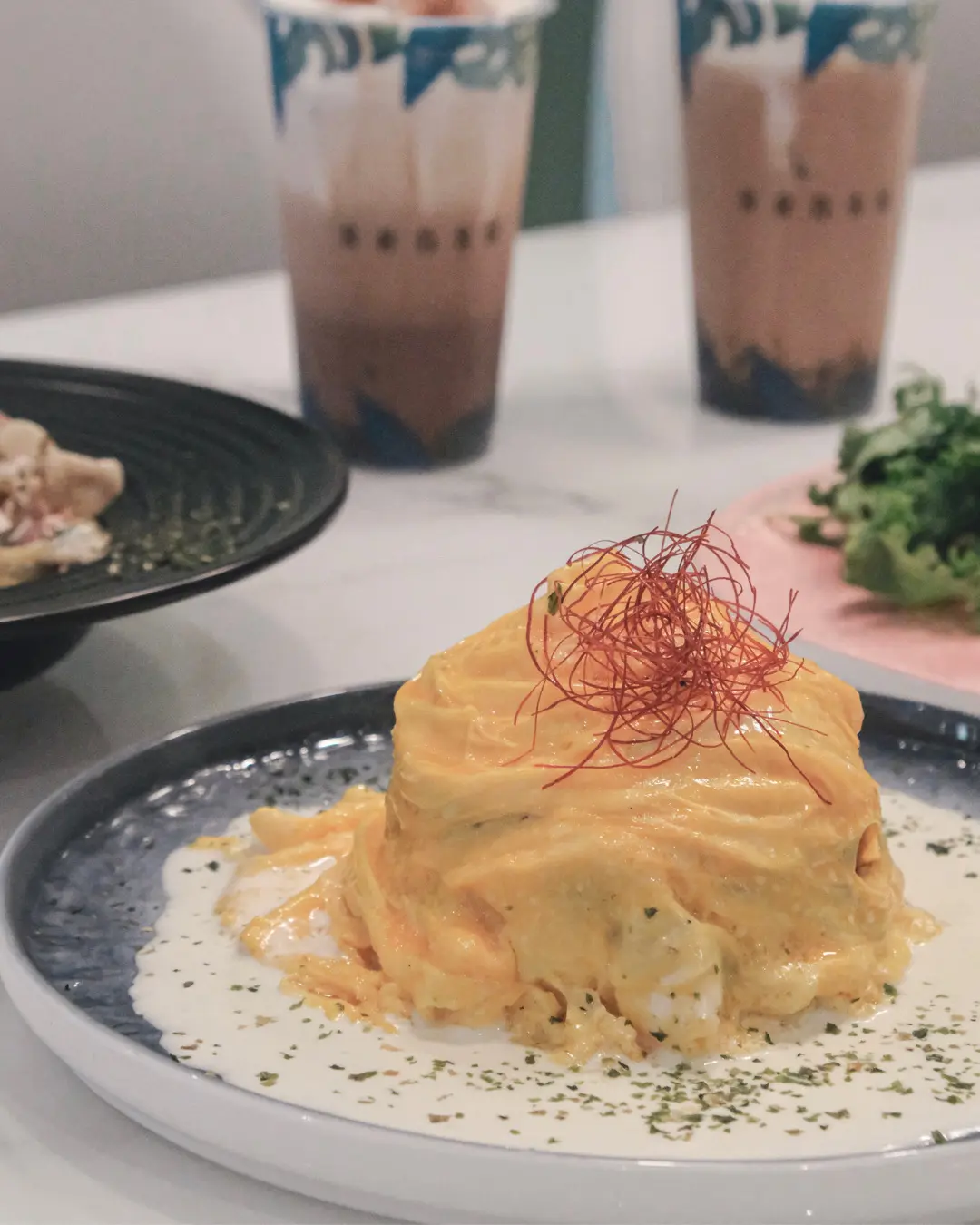 招牌旋風蛋包飯配三文魚野菌