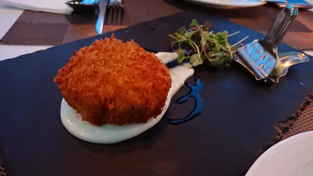 香煎蟹餅伴藜麥蒜泥蛋黃醬
