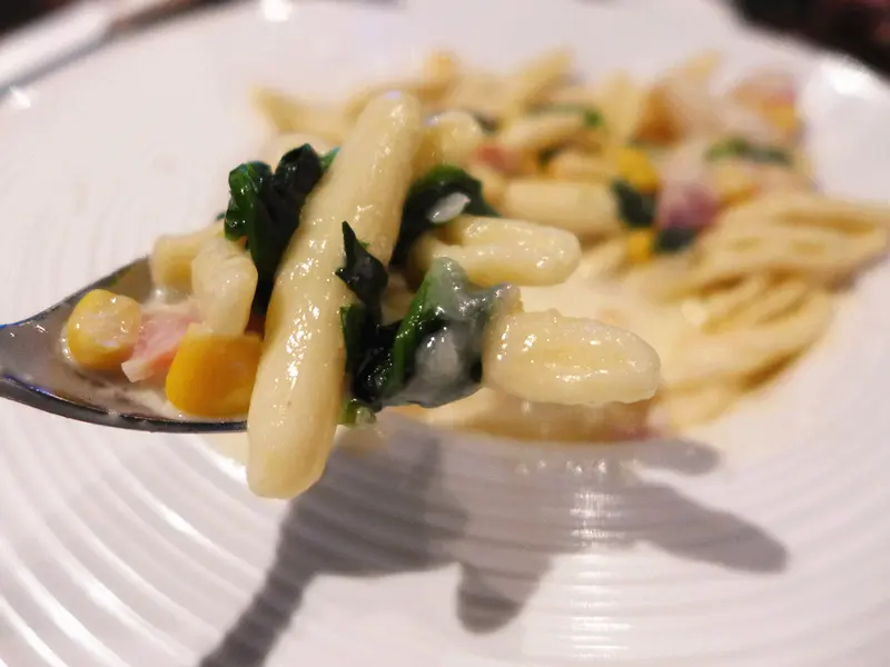魷魚煙肉粟米嫩菠菜慕芝士忌廉汁意手工貝殼粉