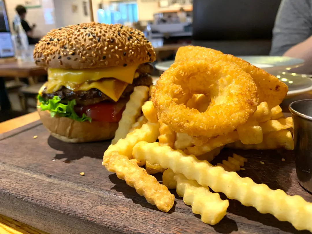 安格斯牛肉芝士漢堡配洋蔥圈、薯條