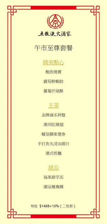 名气潮洲菜 - 五粮液大酒家朋友曾经推介一直都想试试咁啱饭聚想食中餐所以即时谂起🤟🏼环境方面餐厅内全部厢房格局雅致服务方面每间房都有特定服务员由安排茶水到落单都十分贴心食物方面本来想点手工小菜可惜时间太赶冇留意需要2天前预订但系其他菜式都好精致份量亦大大份!潮汕浸花蛤花蛤大大只肉厚十分鲜甜家乡咸鸡(半只)份量大肉滑但系冇乜惊喜潮式拼盘可自选卤味我地点左鱿鱼、鹅肝、鹅片、猪大肠鱿鱼爽口厚身,推介👍🏼潮洲生𩸆蟹(大只)其实四人食唔哂只大蟹但系细蟹卖哂非常值得点嘅菜式多肉多膏调味丰富系嫌辣左少少🤏潮洲蚝烙🦪蚝仔大只食落烟韧亁贝春菜煲用料十足叫左三款汤🥣金不换炖鲜鲍鱼 - 金不换味大左啲但鲍鱼好味🥣咸柠檬炖野生水鸭 - 非常清润🥣胡椒咸菜鲜猪肚汤 - 稳阵之选 👍🏼整体来讲性价比高味道好份量大服务佳绝对系会再去嘅餐厅🤟🏼如果下次想懒少少可以比个budget餐厅帮手订制套餐贴心❤️…查看更多