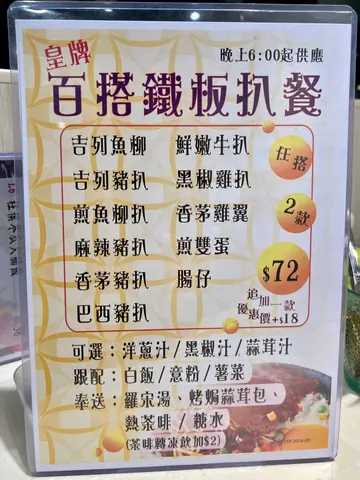 每次黎到,都好钟意食呢个铁板扒餐,可以拣2 款扒,仲有饭 / 意粉,另外仲包大大碗汤,蒜蓉包,仲可以拣汤水,每次都系叫冰冻绿豆沙嘅。次次都一定食哂哂,唔驶加一都系$72,超值呀…查看更多