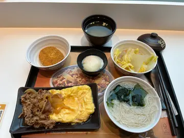 红假下午。周围都吾多人。可能出晒阜或回归祖国下午4时。 静蝇蝇。见到吉野家得成人。有个无敌窗景。就买个下午餐食。牛肉饭一碗。汤一碗。30元。比2𩠌饭贵d.但坐位舒适。有靓景。低晒。牛肉ok.冇渣。饭就珍珠米。太琳。冇乜弹性。算系咁。加了豉油和七味粉。都ok吾太浓味。汤就一般啦。淡淡地。30元套餐。冇乜期待。但望住靓景。环境又宁静和干净。慢慢食一个钟。舒舒服服。都系值得。