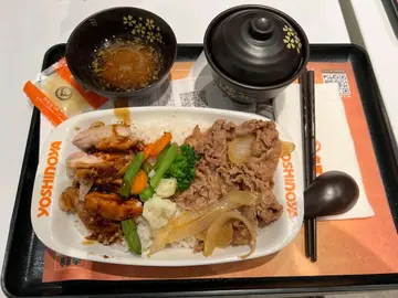 吉野家牛肉饭 今晚又去帮衬沙田嘅吉野家牛肉店,例牌叫番我嘅最爱双拼鸡牛饭,每次食每次水准都保持一致,牛肉唔会有臊味,鸡扒就炸得啱啱好冇柴皮,而牛肉同埋鸡肉嘅份量以六十三个大洋嚟计都好有性价比,如果啲伴饭蔬菜再增加多啲就e支班啦!至于𠮶碗面豉汤就好一般,有少少面豉味道,一句讲晒,够咸。店舖虽然细,唔系得好多张枱,但都有播啲不吵耳嘅日本歌曲,营造出比较轻松自在环境,令我知道自己食紧日本快餐。七点钟见开始人多点餐,堂食同埋外卖都企满晒人等餐,但柜台就只得一个靓女收钱兼要照顾出餐,佢快手快脚,真系我哋香港人一贯做事作风,做嘢快靓正,抵赞!!!仲有一样抵赞嘅系餐桌清洁姨姨表现非常专业,问姨姨攞杯水,佢就亲自入柜台后边,之后亲自送来俾我,冇任何𠮶种霸气嘅表现,又经历一次非常之好食饭体验!吉野家嘅员工加油。…查看更多