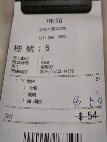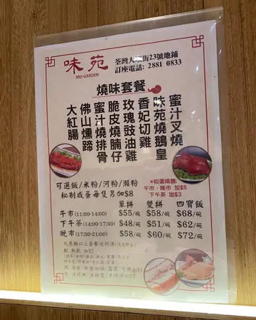 荃湾大坝街味苑烧味,见open rice 内的食评唔错所以入去。味道中规中矩,不过我唔好彩,师傅斩了啲下难烧鹅比我,烧鹅只有肥膏和骨,但烧鹅肉就没有太多。下午茶$58,算是偏贵。尝试过一次就算,个人觉得榕哥会更好!另外,冷气机坏了,店内下层颇热,此店有上层,我表示想上去上一层,但侍应唔比,身完一身汗。说实在,你上层有冷气都唔比人上去,下层坏冷气就叫客人坐下层,估计最大原因是侍应不想行上一层送食物,但这样的安排,我应该就唔会再来!!Read More