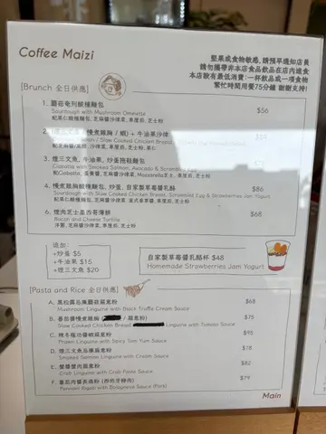 朋友常说咖啡米子的食物不错,但她多数买外卖回家吃,因店面很细,这次她终于屈服陪我去堂食。店内座位不多,要食餐点的话,坐吧枱比较舒适,单饮咖啡就可坐小圆枱,小圆枱要放置两份餐点及两杯咖啡是很勉强。香辣蕃茄酱虎虾扁意粉,虎虾大只爽口,扁意粉弹牙有口感,蕃茄酱的浓稠度恰好。每条意粉都沾满酱汁,微微的辣,好惹味!慢煮鸡胸酸种面包,炒蛋,自家制杂莓酱乳酪 ($86),餐点份量充足,炒蛋嫩滑,鸡胸大大件,肉质不粗糙。配搭微香的酸种面包与酸甜度恰好的乳酪,感觉美味得来又健康。乳酪加入鲜果及燕麦片,口感丰富。泰式奶茶奶油卷,并不会像泰奶茶那么甜,软滑的忌廉带淡淡奶茶香,蛋糕体的湿润度尚可。朋友本想点原味巴斯克芝士蛋糕,落单时只讲了芝士蛋糕,因餐牌上只显示这款芝士蛋糕,结果送来的是蓝莓酱芝士蛋糕。蛋糕的芝士味香浓,口感软滑。和朋友分别点了Iced Mocha和Dirty,自己那杯Mocha稍嫌不够香。主食餐点比起甜品及咖啡好吃,惟连同饮品及甜品,餐点价钱绝不便宜啊。