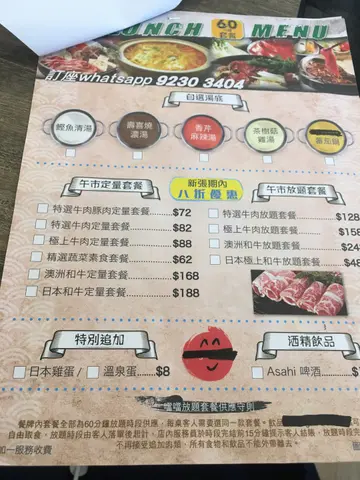 🥩澳洲和牛两小时任食* $197** (含加一*星期五六日用餐时间为1.5小时**原价$359 (不含加一)呢间隐世嘅火锅店满足咗小资少年想任食和牛嘅愿望🫶🏻 虽然唔系啲日本劲高级嘅Ax 和牛,但系都肥瘦适中,质素都唔错。细心留意嘅话佢每一份牛嘅油花分布都唔一样,但食落去口感差唔多都系咁腍,应该只系切唔同部分所致🥸,唔系比客人另一款牛。另外佢哋嘅猪肉都好好食,口感甚至好过和牛🤣。汤底有5款比大家拣(第二幅图),一人一煲,卫生又可以比大家试下唔同味。饮品方面有Anson Lo 代言𠮶只OOHA,仲有支茶&凉茶同支装汽水!!!酒就冇特别留意了。怕肥嘅话可以饮支装梳打水🫶🏻。甜品方面有啫喱、杯装雪糕等,不过小编只系试咗个雪糕,个雪糕有海盐、咖啡、蜜瓜同芒果味🫶🏻当中咖啡味道最突出。其他火锅配料同啲连锁店有嘅款式差唔多。(不过小编建议只系食红肉同少少菜会更加容易回本🫶🏻,所以唔太需要理会啲配料🤙🏻)$200 都唔洗但系有和牛任食,已经非常吸引,而且晚市都系呢个价就真系抵到烂🤙🏻,最适合想同朋友Gathering吹下水咁又想食CP值高嘅边炉放题嘅小资少年少女🫶🏻。卖相:N/A (牛:⭐⭐⭐⭐⭐)味道:⭐⭐⭐⭐CP值:⭐⭐⭐⭐⭐…查看更多