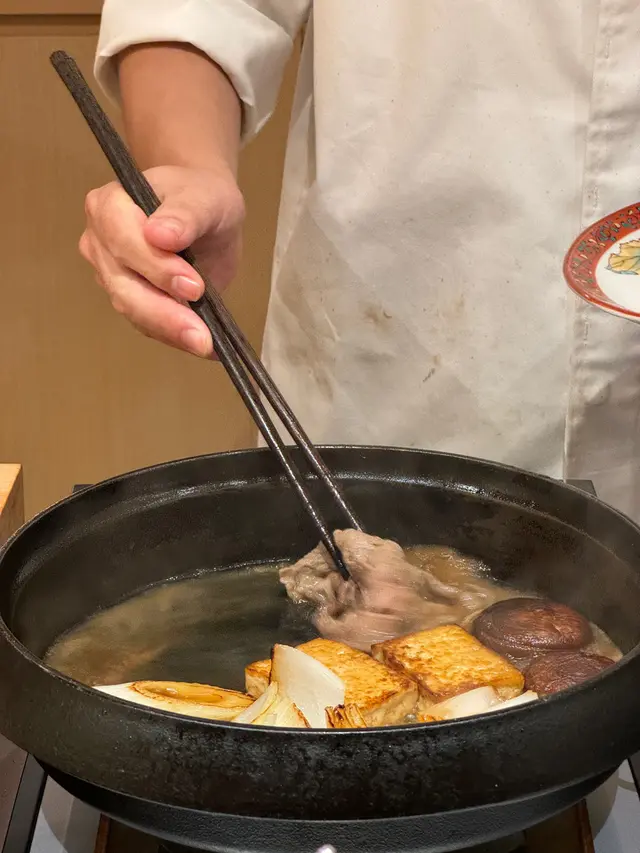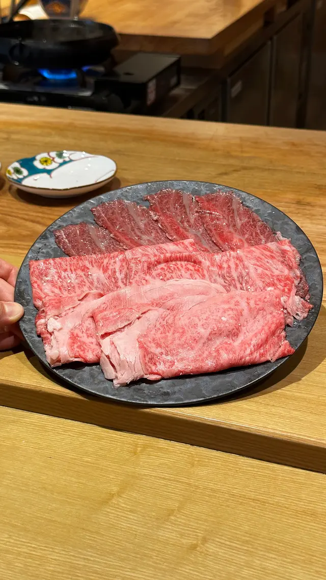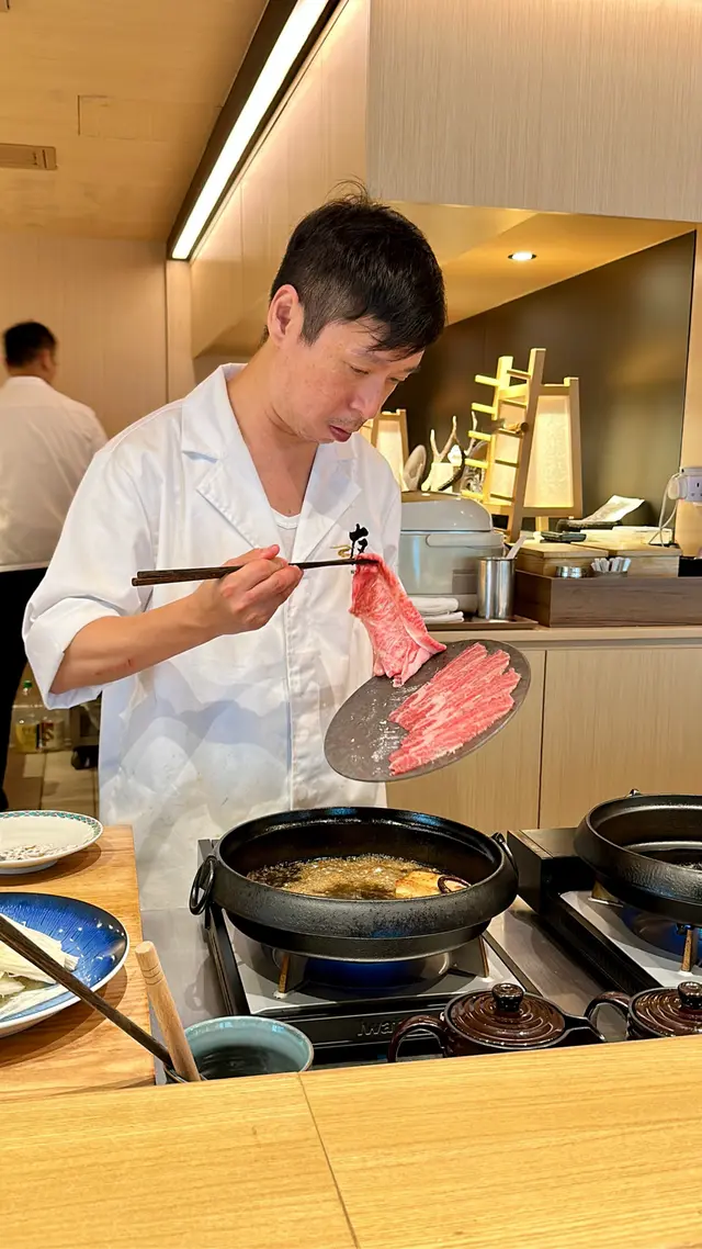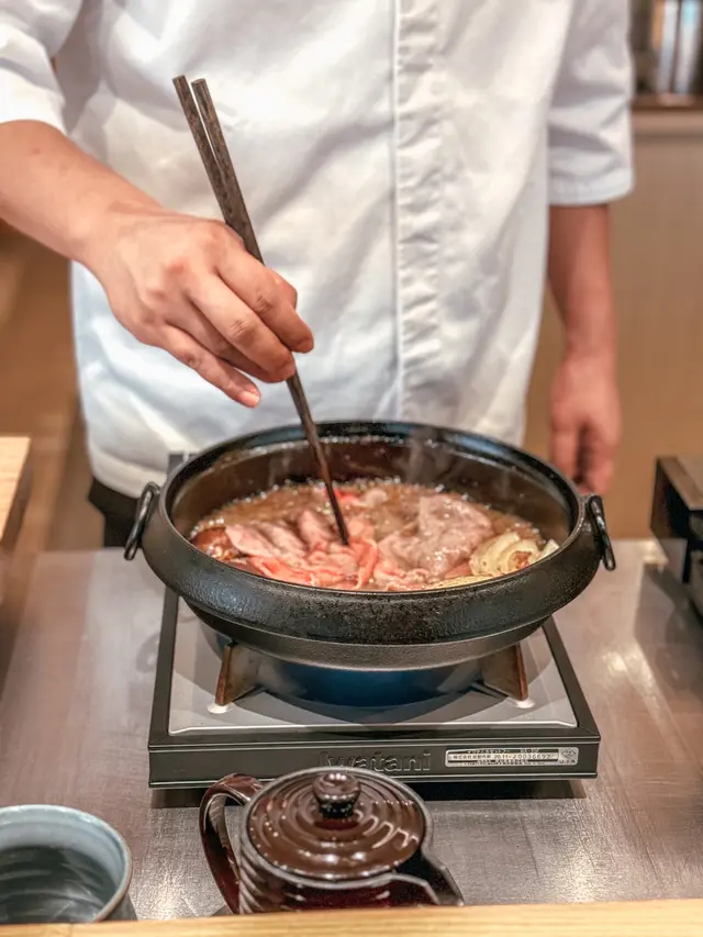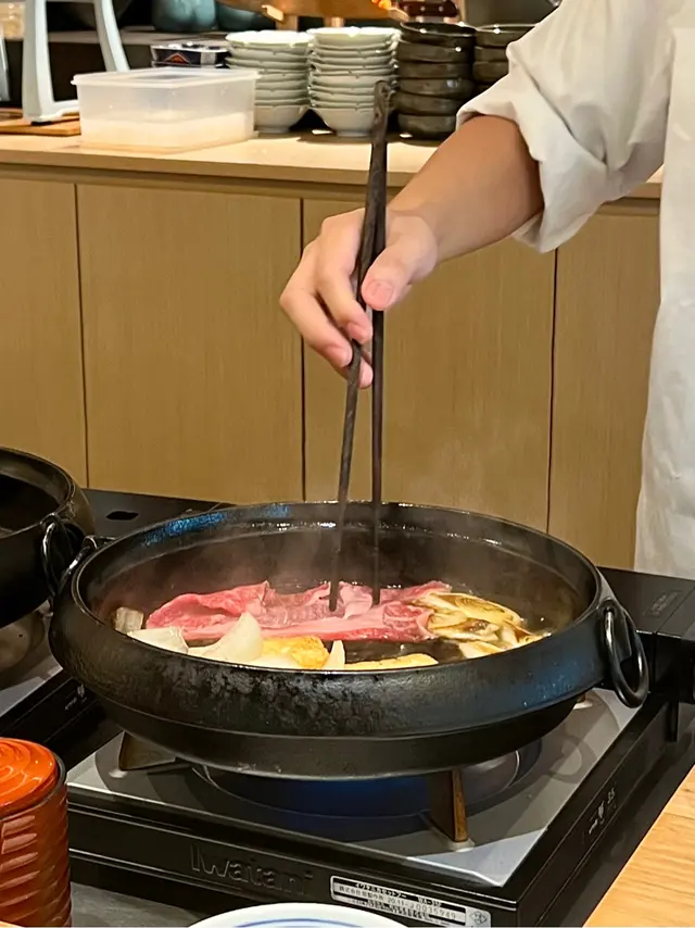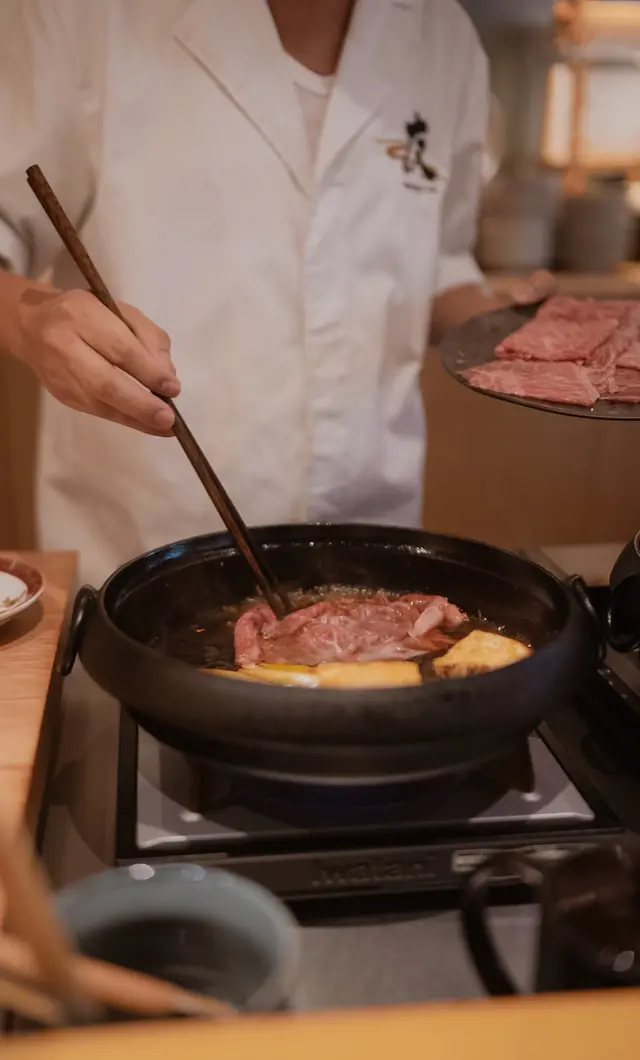 位於銅鑼灣嘅「壽喜燒友」 係一間廚師發辦嘅壽喜燒店,今次坐喺吧枱用餐可以近距離見到廚師烹製和牛同其他食材過程。今次黎試下佢地嘅 sukiyaki dinner set (HKD680/pp),首先上菜嘅係用熊仔空心餅裝住嘅牛肉他他,然後係3款各有心思嘅前菜,食完即刻好開胃咁等待品嘗主菜和牛壽喜燒😋今次嘅壽喜燒有3款A4和牛,包括有1片肉眼,1片西冷以及2片肩肉,由廚師以壽喜燒汁烹調,再配合蛋黃汁去進食,無論味道定口感都係一流!3款和牛味道各有特色,可以品嘗到和牛的不同口感。野菜方面則有5款,每吃過一款和牛後便會附上,有助解油膩用,另外米飯可無限次追加。吃過雞蛋蓋飯後,廚師更即場以刨冰機製作紅豆抹茶刨冰,為今餐壽喜燒劃上完美句號。推薦大家去試看看!…查看更多