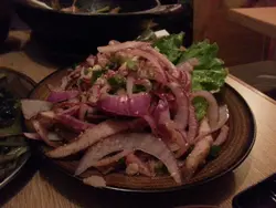 朋友介紹來这间小小的泰國菜饭店,本來期望不高,估不到原來相當不錯,可以再來。先说这里的裝修,看得出花了不少錢,最贊的是洗手間,十分乾淨,洗手盤也很有特色。閒話不多说了,最重要是食物質素如何,店員哥哥介紹了这里几个必'食菜式,我們全都要了,果然没有失望。首先是:)柚子沙律,柚子非常新鮮,配料才出色,花生完全冇益味,他們说是自己炒的,椰絲也是自己炒的,生菜全是BB菜,最甜的部分。再來是这里的招牌:)楊氏烏头,果然一点泥味也没有,而且燒得刚刚好,不會太熟太鞋,还有黄油在內,非常美味。其他燒烤也很好吃,:)燒自家打的墨魚棒,墨魚相當弹牙,讓在內的甘蔗棒仍水分十足,而且很是甜。:)燒壕相當清甜,因為这里是用新鮮生壕烧,外面較少这样造,所以燒出來还帶有海水味,一定要试。还有其他燒烤也十分好吃:)牛肩肉,羊架,北海道带子,茄子等等,不多说了。还有:)青咖哩軟蟹,咖哩味道十分適中,不会太辣,带少少耶计甜味,十分适合我。:)招牌炒飯雖然沒什麼特別,但廚師炒得煱气十足,每粒飯也分开的,比起茶记的炒飯好食得多。最可惜是吃不到黄咖哩炒蟹和芒果糯米飯,下次來必'定先預订。这里除了食物不错,服務也十分贊,那個店員哥哥不知是否老闆,十分有礼貌,有耐性地向我們介紹食物,而且看來对红酒有一定的研究,給了我們不少红酒知識,最值得一贊是他给我們红酒杯前,可能見不太乾淨,我見到他每只清潔过后才给我們,服務态度一流。但这里有點不好的地方,就是出菜时间,我們还好,隔離的一对情侶便十分不滿,他們说等了40分鐘只食过一串立腸,可能真是太多客人的关係,希望可以改善一下。查看更多