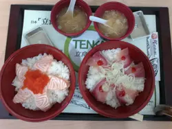 提交報告的限期將至,真的忙得午飯也沒時間吃上司"建議"一起買外賣速食,便去了以為會到快活家樂美心之類,豈料來到了這家來到,午市時間也未有客人,店員也在發呆(香港人的工作態度就是這樣)明知山有虎,就選了最Cheap的角切魚生飯作罷,就帶回公司包裝是很精美的,就是連盛魚生飯的膠碗也是硬身的加上盛豉油的膠金碟和製作精美的白色膠袋,心想,這碗飯,有多少錢在這方面花了魚生有三文魚粒,吞拿魚粒,白立魚,數量不少的,但都沒什麼味道,有欠新鮮最搶眼的,竟是青瓜,新鮮爽口,竟是最能刺激味蕾的一款麵豉湯,也是咸得出奇,同事更醒目地提示我要去加多一杯水來中和一下才飲用可幸飯粒尚算軟綿,還帶點黏口,加點豉油伴吃是不錯的我含着淚:((或許是因為芥末醬落得太多),把整碗飯吃完,繼續工作!查看更多