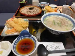 每天經過天丼都見到勁多人排隊,難得見到排隊嘅人唔算好多就去排下試下新嘢。排咗大約十分鐘左右就有位,唔算話等得太耐,可以接受嘅程度。我地點咗《豚骨白湯蕎麥麵》同《天婦羅蕎麥麵》兩個set,佢個set嘅天婦羅有兩隻虎蝦,仲有蟹柳、茄子、蓮藕同四季豆。佢個天婦羅嘅粉漿唔算好厚,亦炸得好鬆脆,唔會好油淋淋,呢方面佢處理得好好。我點個餐係《豚骨白湯蕎麥麵》,佢個湯底嘅味道同出前一丁個豬骨濃湯味幾乎一樣,係一種熟悉嘅味道。豚骨白湯同蕎麥麵加埋一齊亦冇違和感,雖然習慣咗食蕎麥麵係凍食,原來熱食都一樣咁好食。而《天婦羅蕎麥麵》則係正常水平,蕎麥麵正常都唔會有太大嘅反差。我哋另外點咗個茶碗蒸,個蛋蒸得好滑,材料亦算豐富,但比較另一間知名壽司店嘅茶碗蒸,都有一段距離差距。今次蠢咗嘅係我哋點嘅嘢係幾乎一樣,應該要點一個飯就理想啲,下試要試下佢其地嘅丼飯,始終我覺得佢嘅飯出名過麵。…查看更多